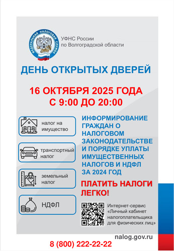 Межрайонная ИФНС России № 3 по Волгоградской области (далее – Инспекция) сообщает, что 16 октября 2025 года с 9.00 до 20.00 в Инспекции пройдет День открытых дверей для налогоплательщиков – физических лиц!