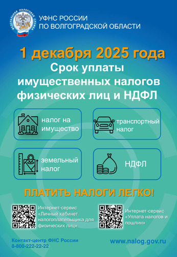 Напоминаем, что срок уплаты физическими лицами транспортного, земельного налогов, налога на имущество и налога на доходы физических лиц по налоговым уведомлениям – не позднее 1 декабря 2025 года.